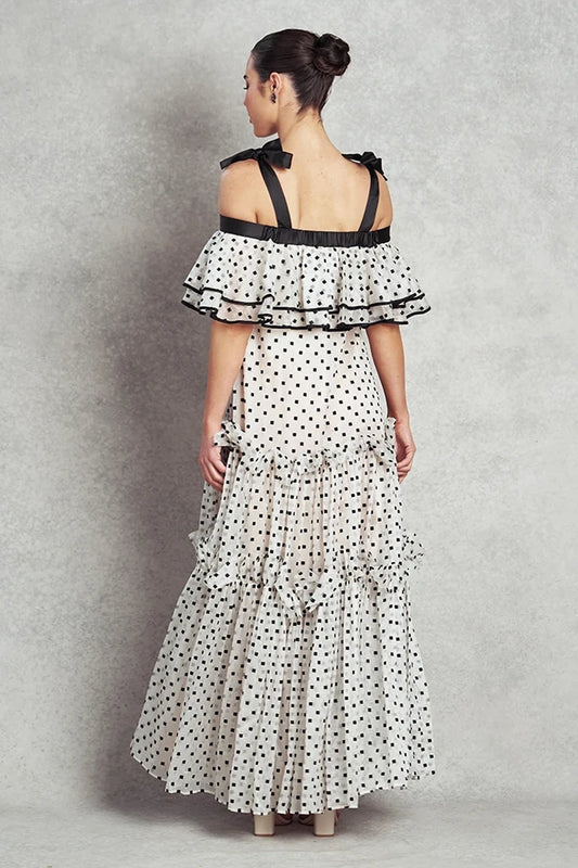 Happiness Dress | White with Black Polka Square Embroidery |